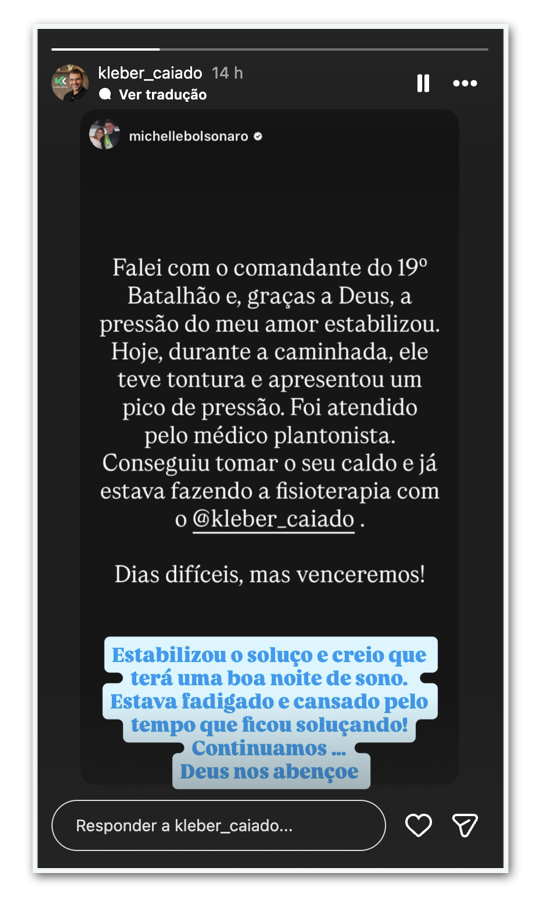 O fisioterapeuta de Bolsonaro, Kleber Caiado, compartilhou o post de Michelle e acrescentou a seguinte mensagem: “Estabilizou o soluço e creio que terá uma boa noite de sono. Estava fadigado e cansado pelo tempo que ficou soluçando”.