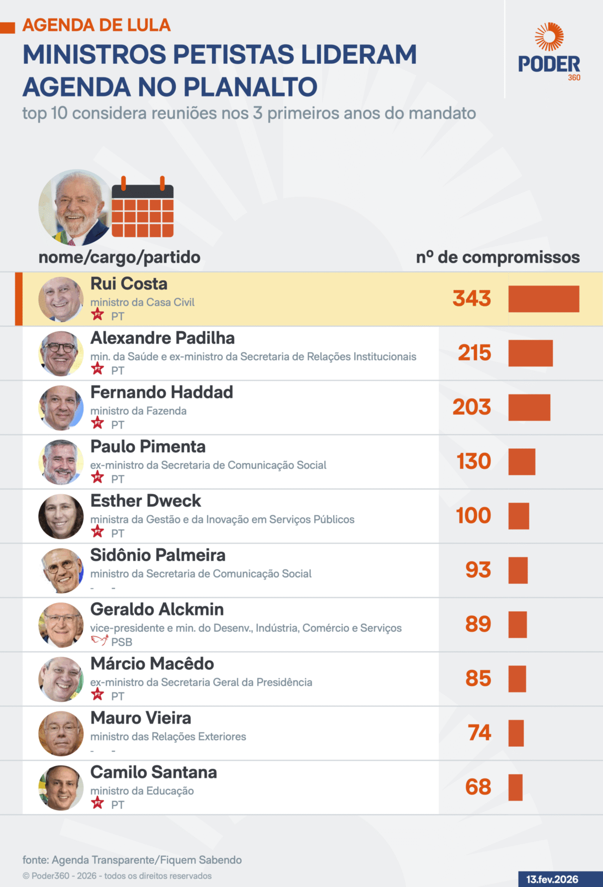 O ministro da Casa Civil, Rui Costa, consolidou-se como a figura mais influente do 3º governo Luiz Inácio Lula da Silva (PT). De janeiro de 2023 a dezembro de 2025, o ex-governador da Bahia reuniu-se 343 vezes com o presidente –quase o dobro do 2º colocado, Alexandre Padilha, o ministro da Saúde e ex-ministro da […]