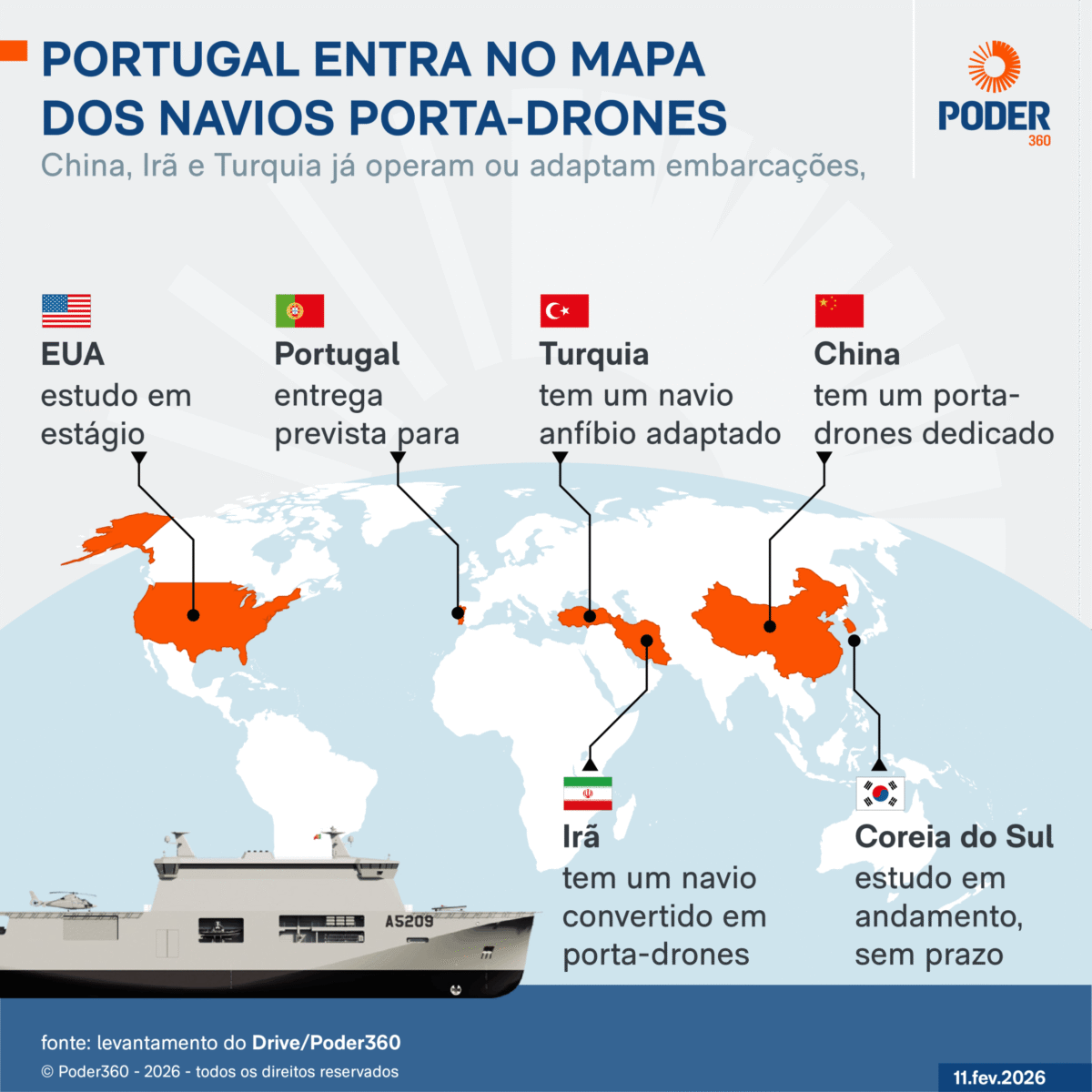Portugal caminha para operar o 1º navio porta-drones concebido na UE (União Europeia), o NRP d. João 2º, também descrito como uma plataforma naval multifuncional capaz de lançar e recuperar drones aéreos e marítimos em missões de longa duração. Pelo menos 3 marinhas já têm ou desenvolvem navios com convés voltado a operações com drones: […]