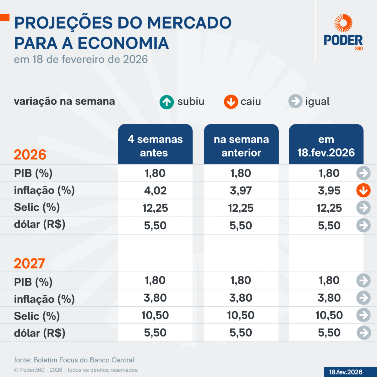 Os agentes do mercado financeiro reduziram pela 6ª reunião consecutiva a estimativa para a inflação de 2026. A mediana das projeções caiu de 3,97% para 3,95%. O BC (Banco Central) divulgou o Boletim Focus nesta 4ª feira (18.fev.2026). Eis a íntegra do relatório (PDF – 919 kB). A taxa anualizada do IPCA (Índice Nacional de […]