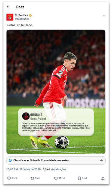 Benfica e Prestianni negam insultos racistas contra Vini Jr.