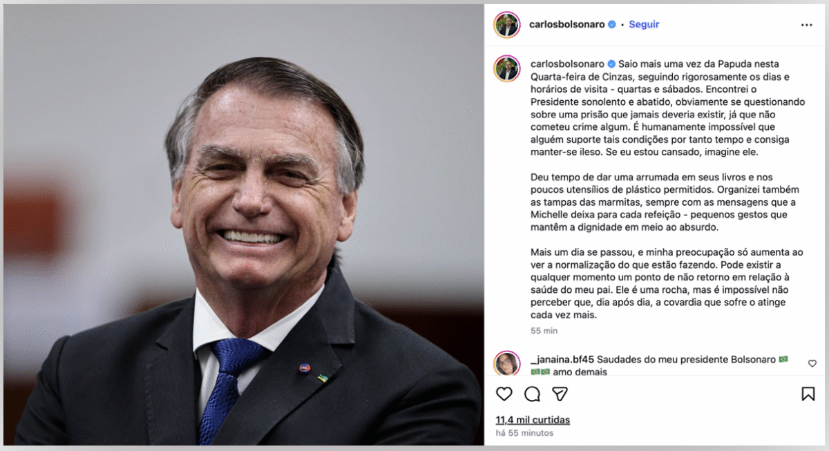 O vereador Carlos Bolsonaro (Republicanos-RJ) publicou nesta 4ª feira (18.fev.2026) um post no Instagram no qual detalha o estado de saúde e a rotina de visitas do ex-presidente Jair Bolsonaro (PL), que cumpre prisão no Complexo Penitenciário da Papuda. Após a visita, o parlamentar descreveu o pai como “sonolento e abatido”. Durante a visita, o vereador […]