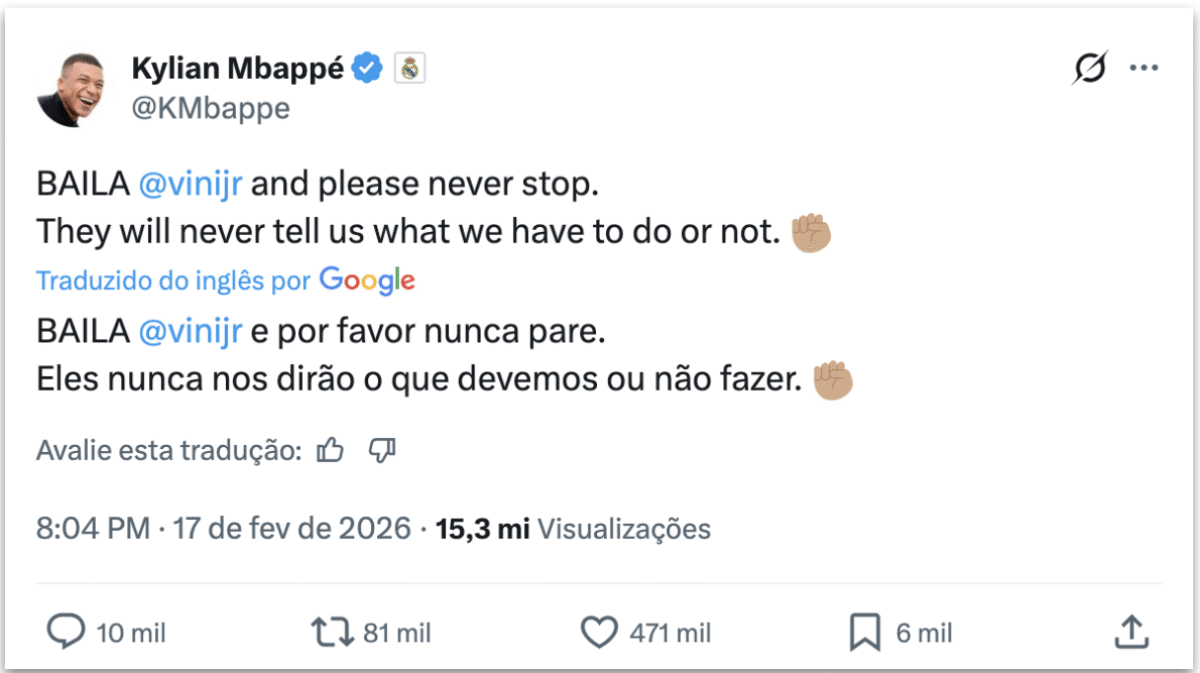 O atacante Kylian Mbappé afirmou na 3ª feira (17.fev.2026) que Vini Jr. foi chamado de “macaco” 5 vezes por Gianluca Prestianni, do Benfica, durante vitória do Real Madrid por 1 a 0. A partida foi disputada no no Estádio da Luz, em Lisboa, pelos playoffs da Uefa Champions League. Segundo Mbappé, os insultos vieram depois […]