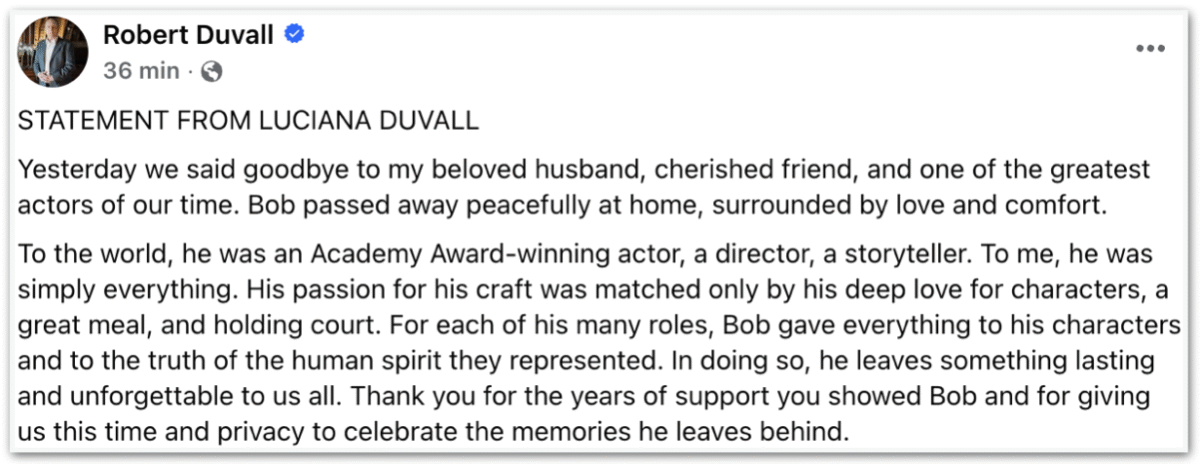 O ator norte-americano , conhecido por seu papel em “O Poderoso Chefão”, morreu no domingo (15.fev.2026), aos 95 anos. A informação foi confirmada por sua mulher, a atriz Luciana Duvall. A causa não foi informada. “Ontem nos despedimos do meu amado marido, amigo querido e um dos maiores atores do nosso tempo. Bob morreu em […]