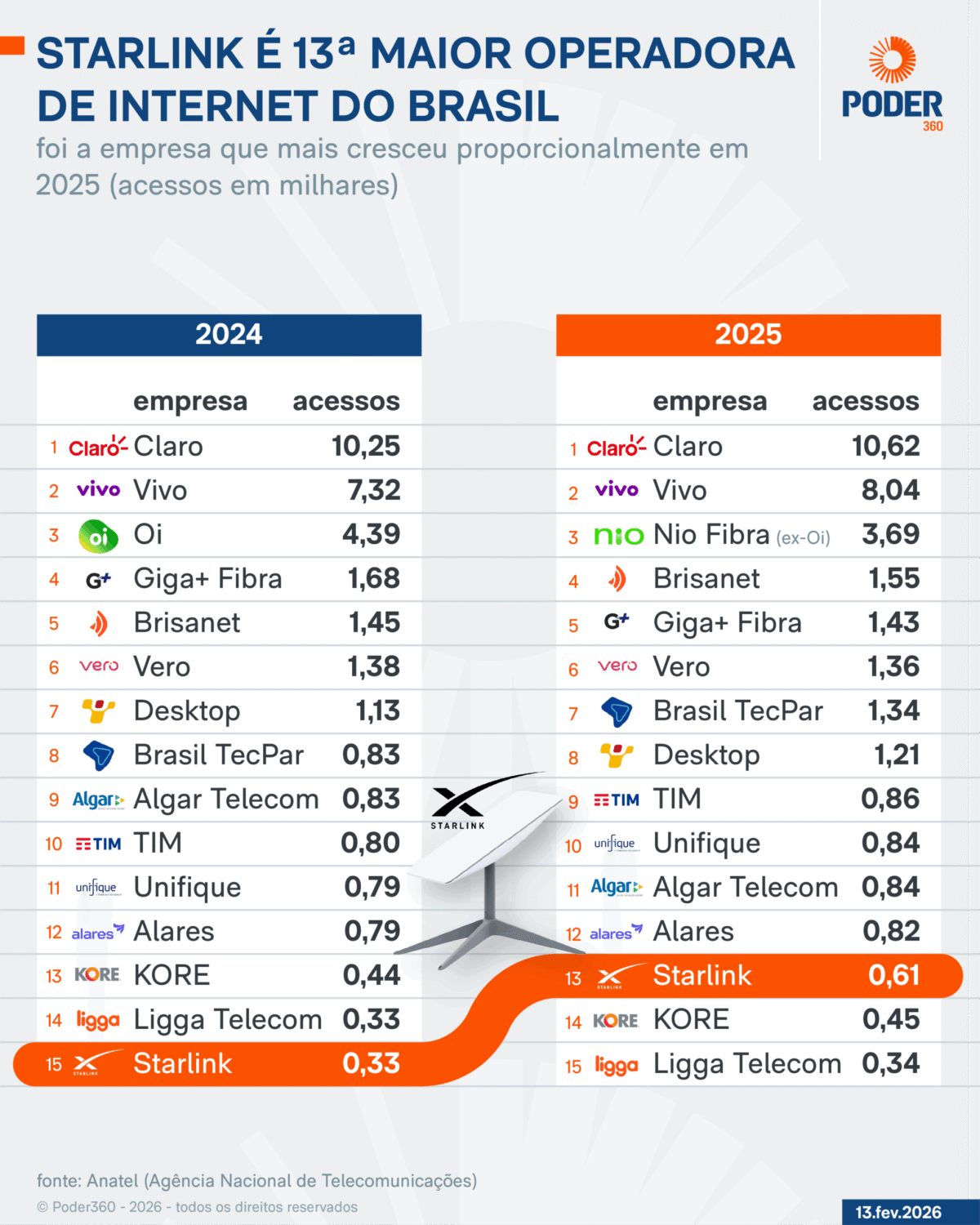 A Starlink, do empresário Elon Musk, aumentou em 85% seu número de clientes em 2025 no Brasil. A empresa tornou-se a 13ª maior operadora de internet no Brasil. Essa alta foi muito maior do que a média geral de crescimento do setor, de 3% no ano. O levantamento é do Poder360 com dados da Anatel […]