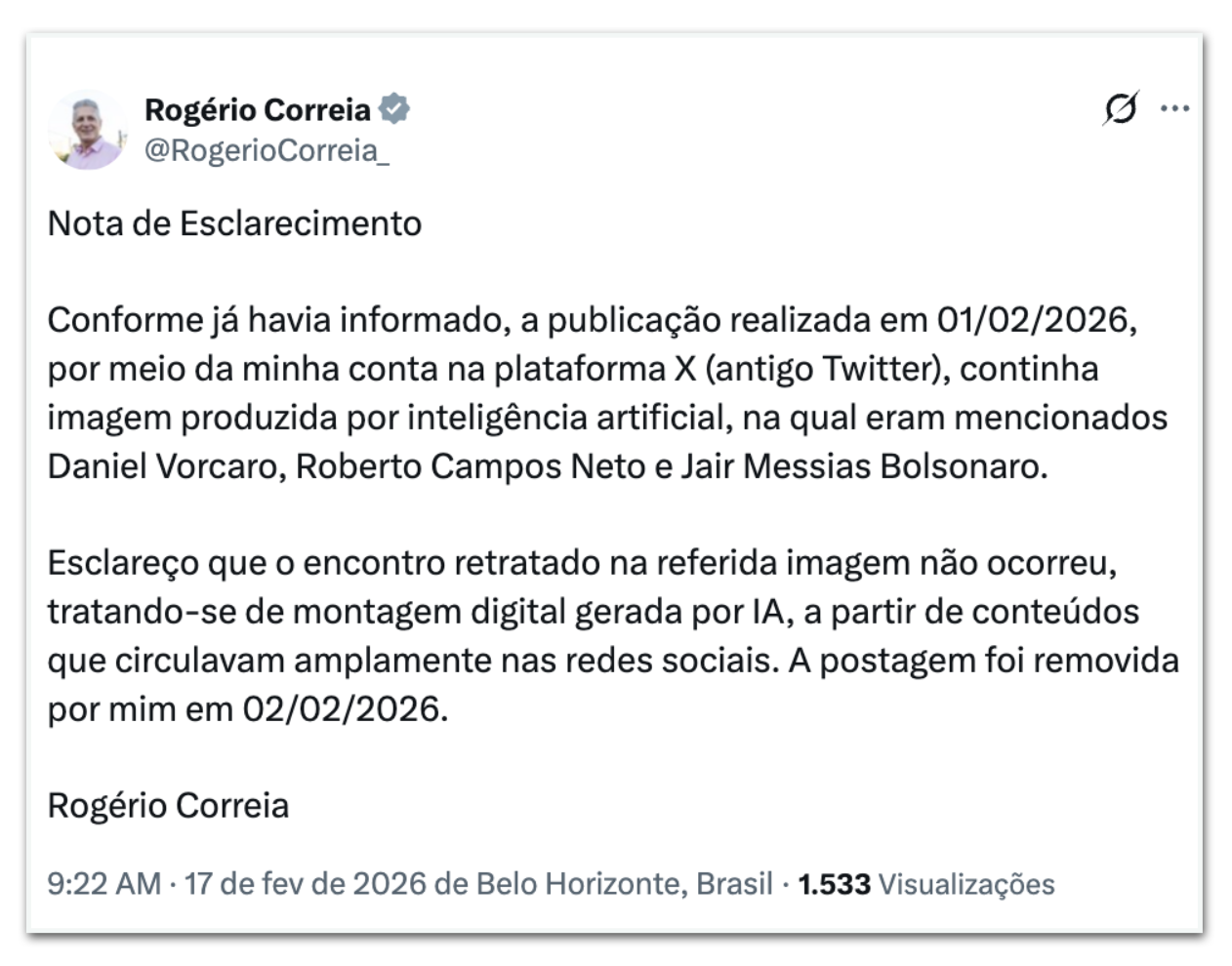 O deputado federal Rogério Correia (PT-MG) se retratou nesta 3ª feira (17.fev.2026) por ter compartilhado nas suas redes sociais uma montagem do ex-presidente Jair Bolsonaro (PL) com o banqueiro Daniel Vorcaro, fundador do Banco Master, e o ex-presidente do Banco Central, Roberto Campos Neto.