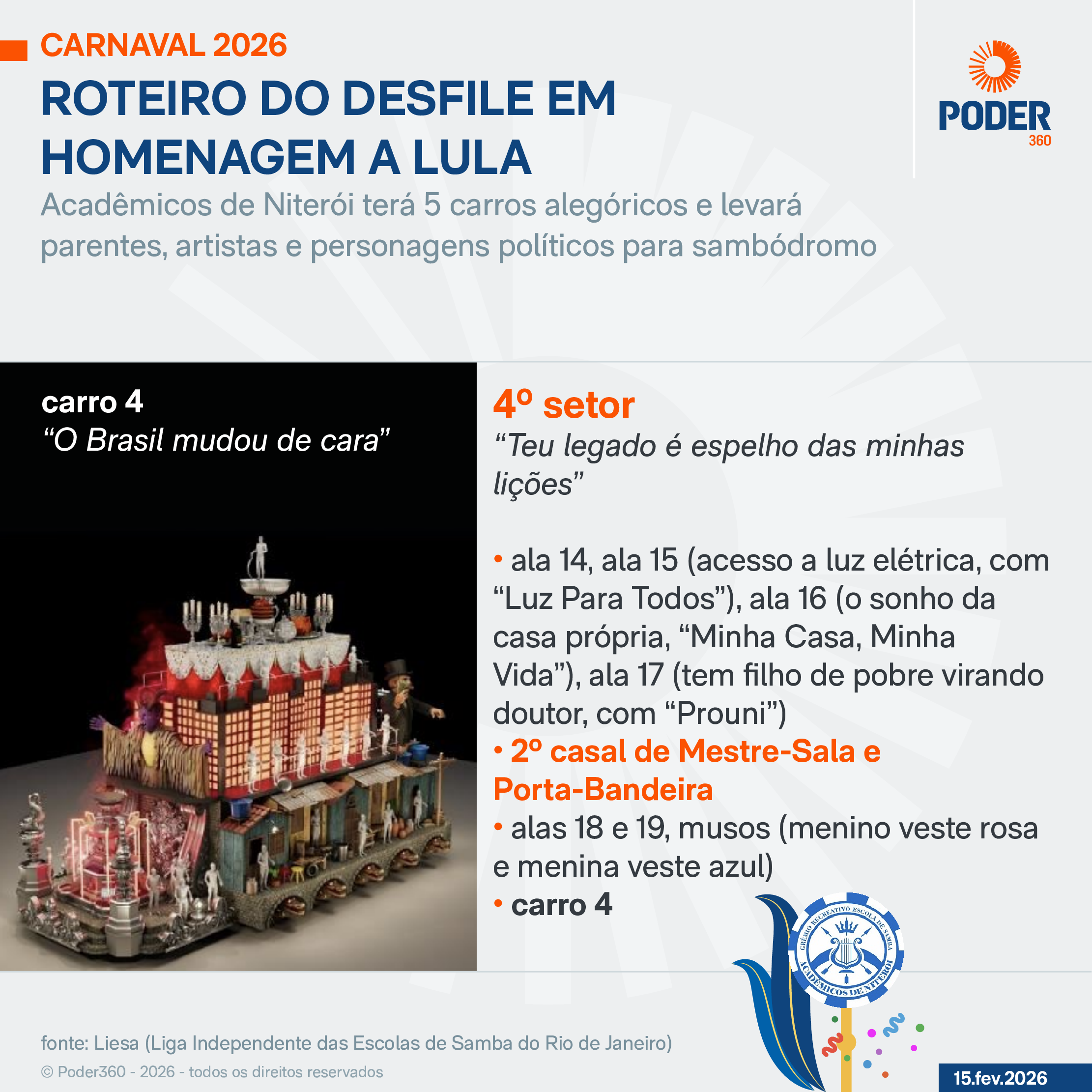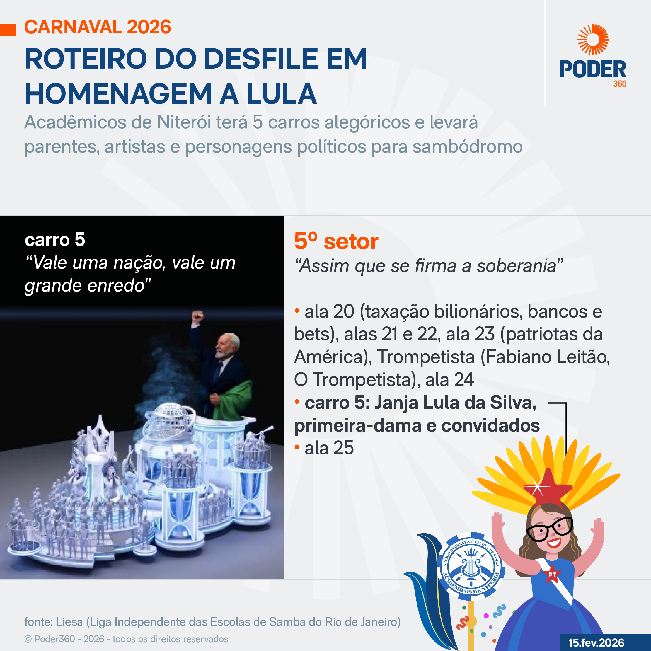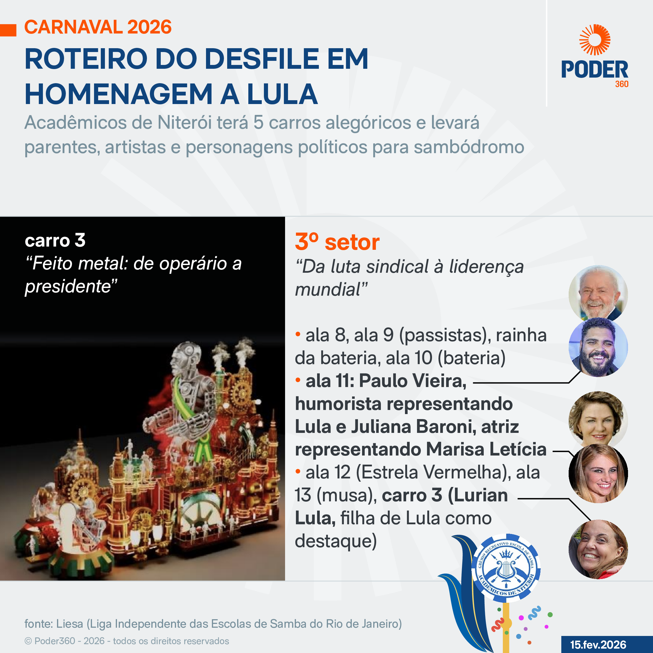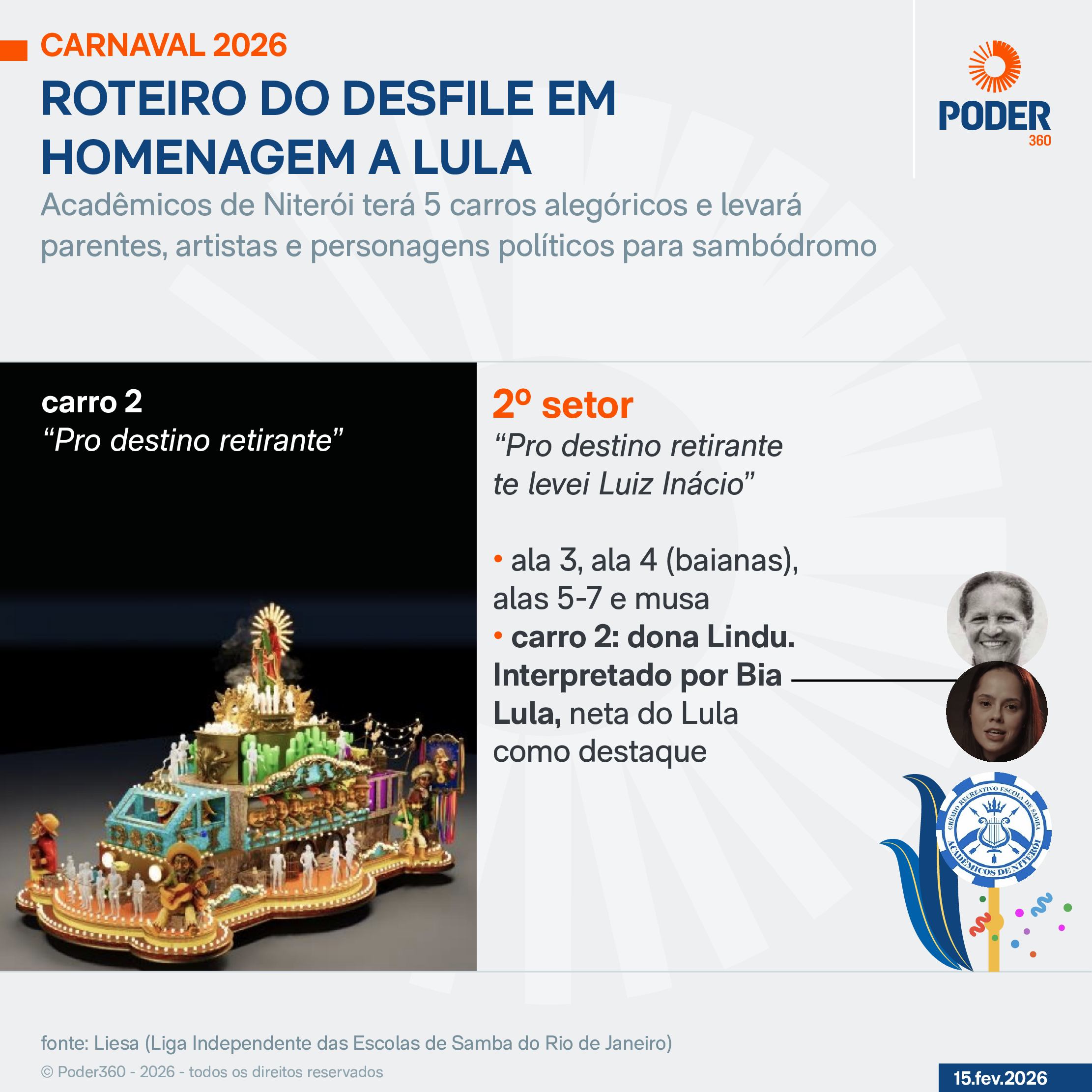 A Acadêmicos de Niterói abrirá os desfiles do Grupo Especial do Carnaval do Rio de Janeiro neste domingo (15.fev.2026) com um enredo em homenagem ao presidente Luiz Inácio Lula da Silva (PT).
