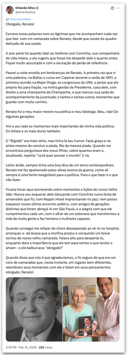 A morte do ex-presidente nacional do PC do B, Renato Rabelo, neste domingo (15.fev.2026) provocou reações de políticos de esquerda nas redes sociais.