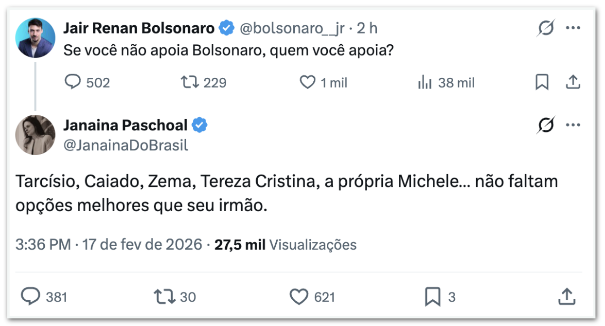 A interação começou quando Jair Renan, filho do ex-presidente Jair Bolsonaro (PL), questionou quem as pessoas apoiariam “se não apoiam Bolsonaro”. Em resposta, a vereadora citou os governadores Tarcísio de Freitas (Republicanos-SP), Ronaldo Caiado (PSD-GO) e Romeu Zema (Novo-MG), além da senadora Tereza Cristina (PP-MS) e a ex-primeira-dama Michelle Bolsonaro.