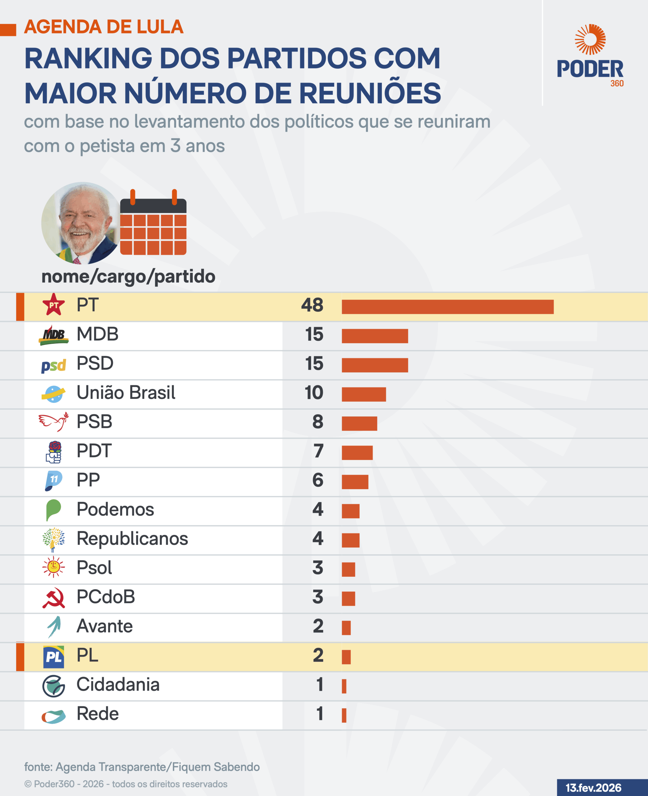 Os dados para esta reportagem foram obtidos a partir da Agenda Transparente, a ferramenta da Fiquem Sabendo para monitorar os encontros das autoridades do Governo Federal. Foram analisados todos os compromissos do presidente da República de 1º de janeiro de 2023 a 31 de dezembro de 2025. Para isso, foram consideradas só as autoridades citadas nominalmente na agenda presidencial. Eis a íntegra do relatório da Fiquem Sabendo (PDF – 613 kB).