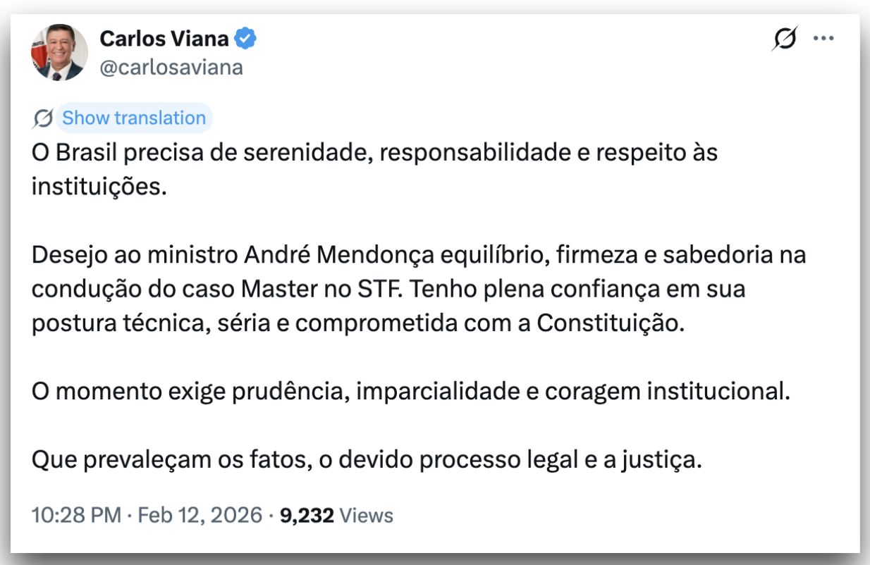 Já o senador Carlos Viana (Podemos-MG), presidente da CPMI do INSS, afirmou confiar na condução técnica de Mendonça e defendeu prudência e respeito aos fatos na análise do caso.