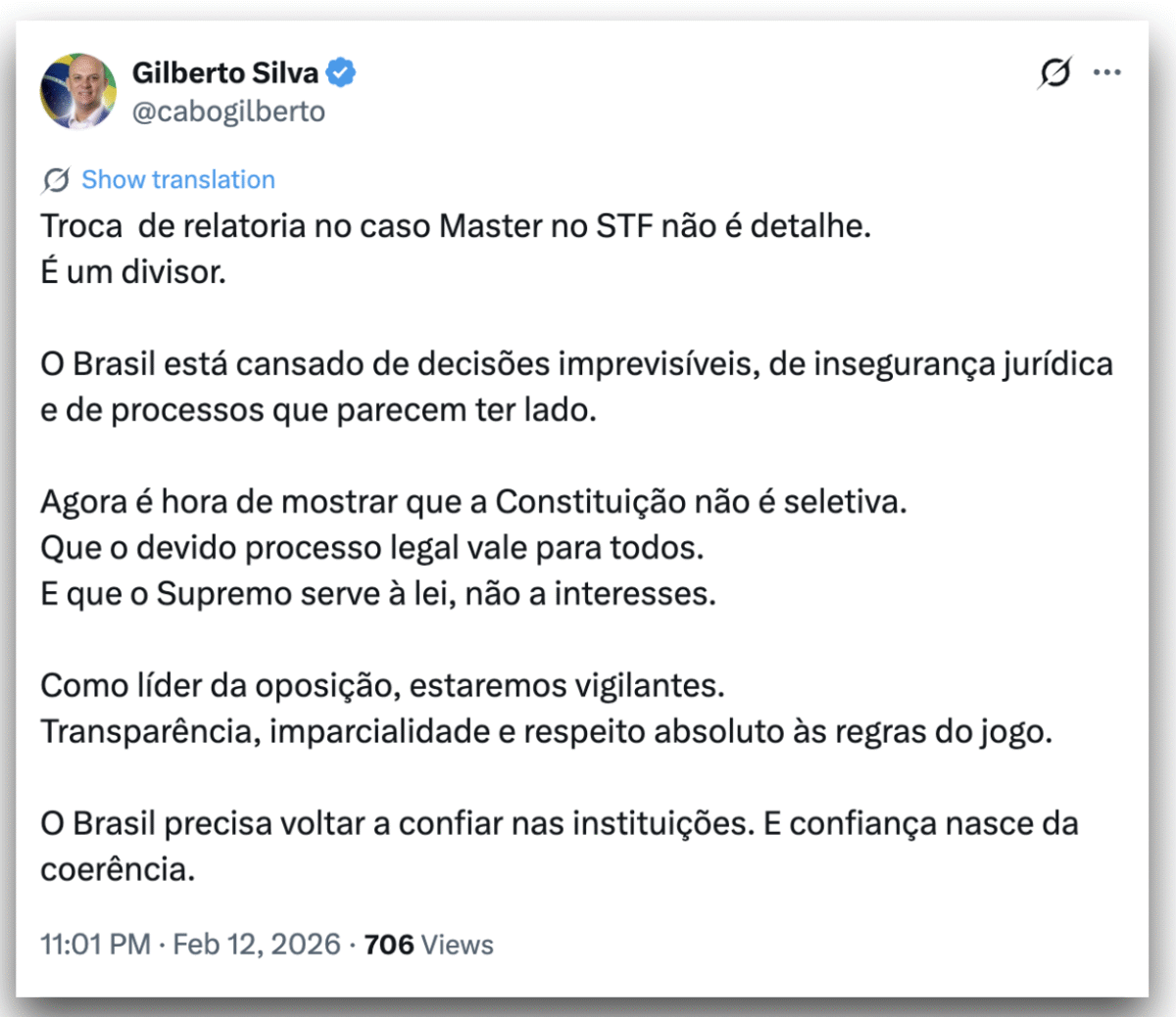 O líder da oposição na Câmara, deputado Gilberto Silva (PL-PB), afirmou que a troca representa uma oportunidade para recuperar a confiança nas instituições. Disse que a oposição acompanhará o processo e cobrará transparência, imparcialidade e respeito ao devido processo legal.