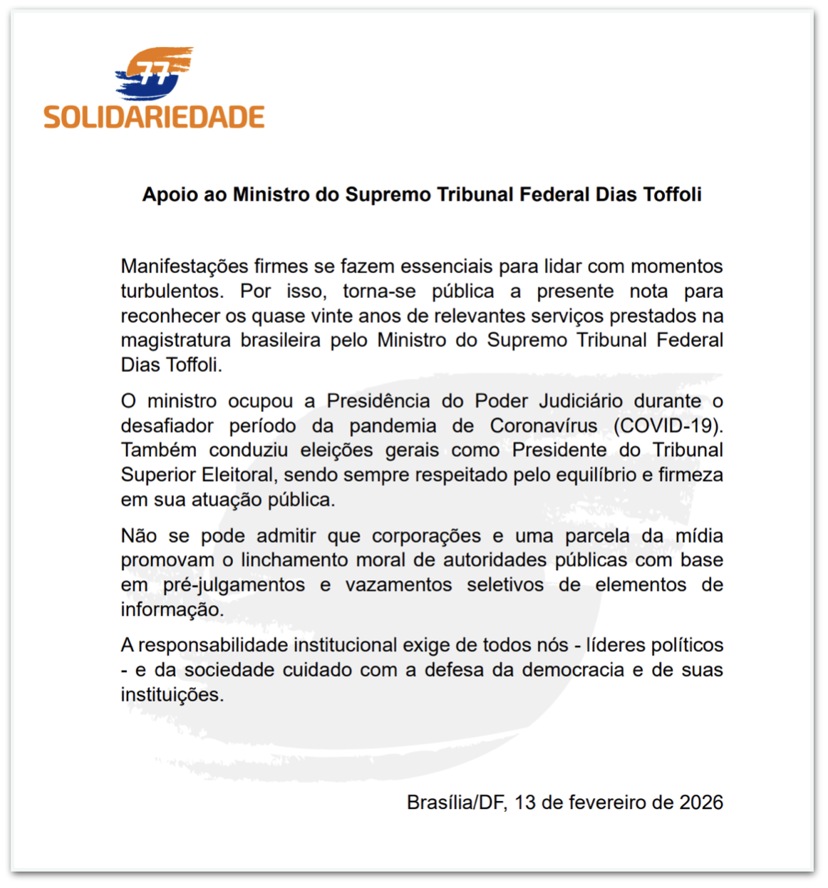 O presidente do Solidariedade, Paulinho da Força (SP), também defendeu a atuação de Toffoli no Supremo. “Não se pode admitir que corporações e uma parcela da mídia promovam o linchamento moral de autoridades públicas com base em pré-julgamentos e vazamentos seletivos de elementos de informação”, diz um trecho do comunicado.