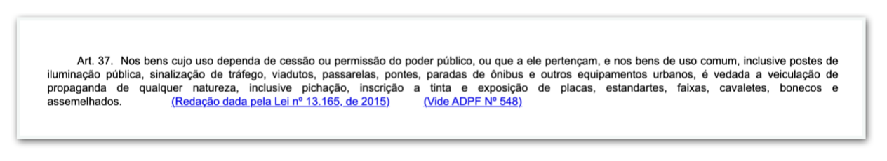 O artigo 37 da lei impede em qualquer data a veiculação de propaganda em “bens cujo uso dependa de cessão ou permissão do poder público”. Isso inclui vários “equipamentos urbanos”, como postes e pontes, segundo a lei.